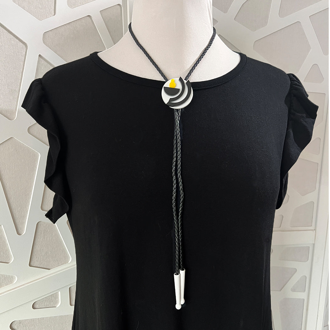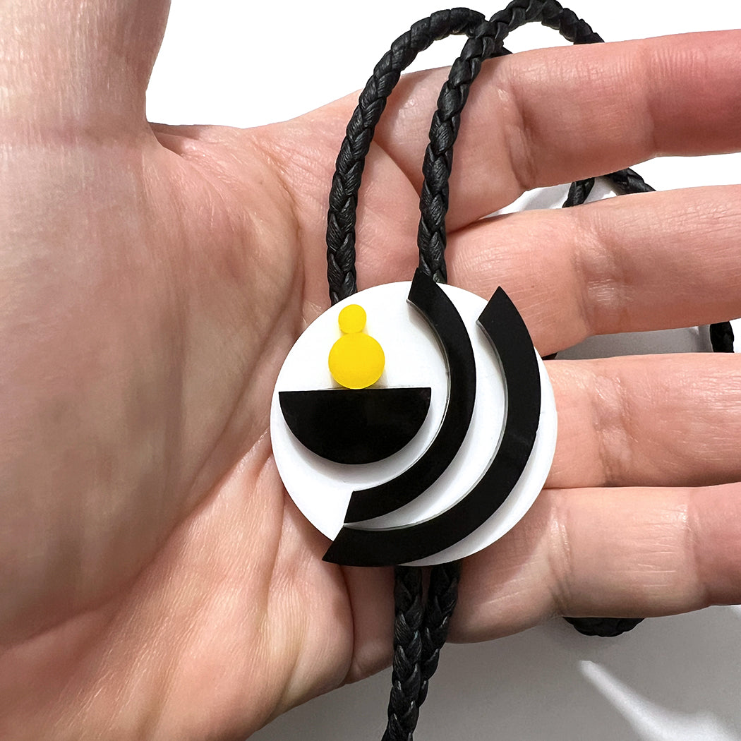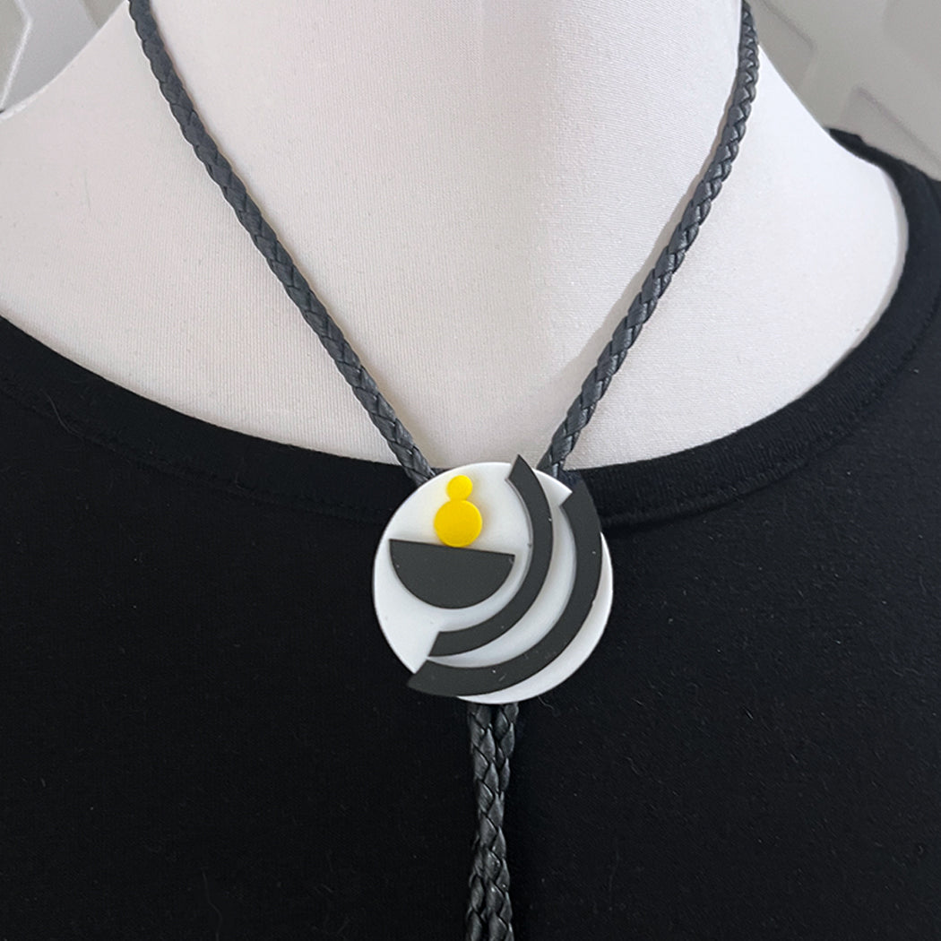 The Balance Geometric Bolo Tie draws inspiration from modern art, perfect for showcasing your artistic spirit. Featuring white, black, and yellow hues, it is crafted from vegan leather and is truly unique. The tie measures 40 inches in length.