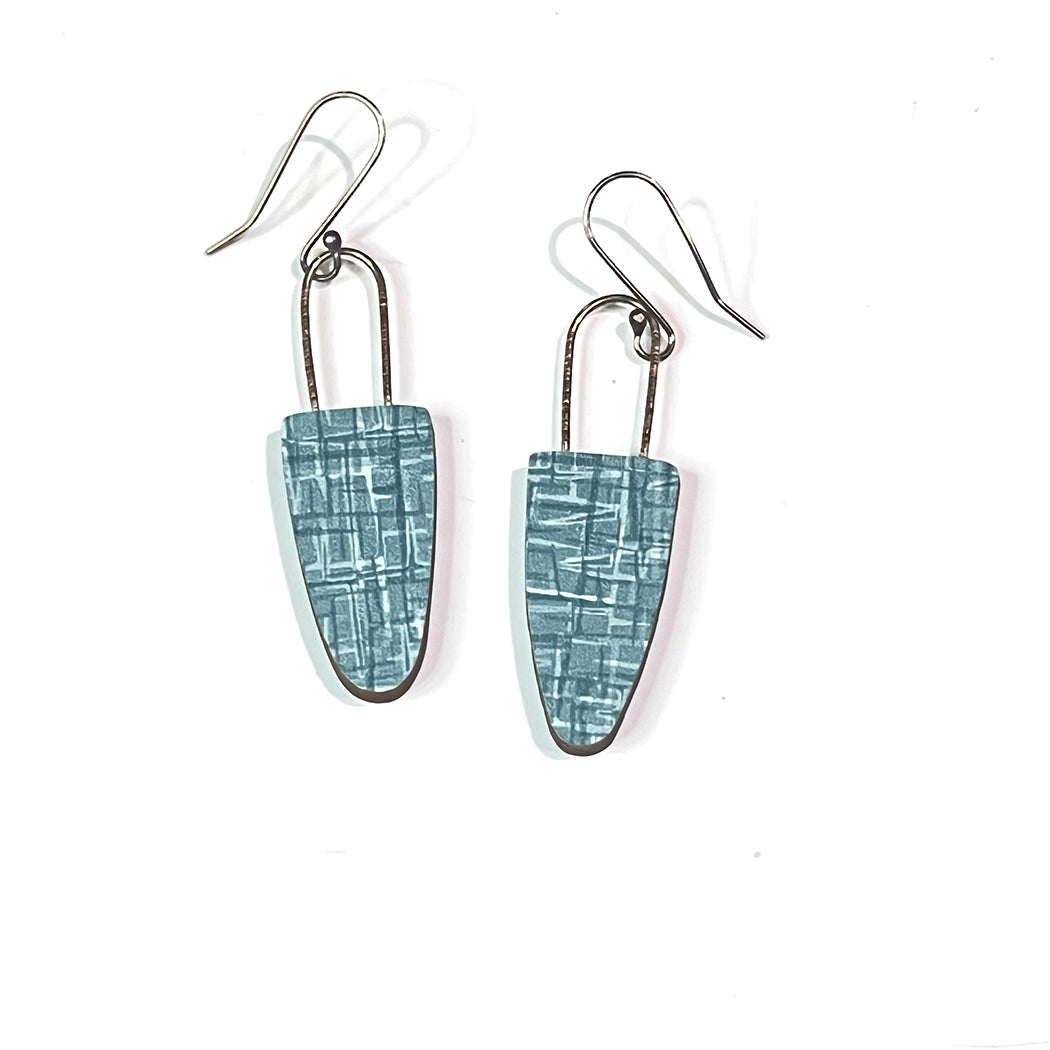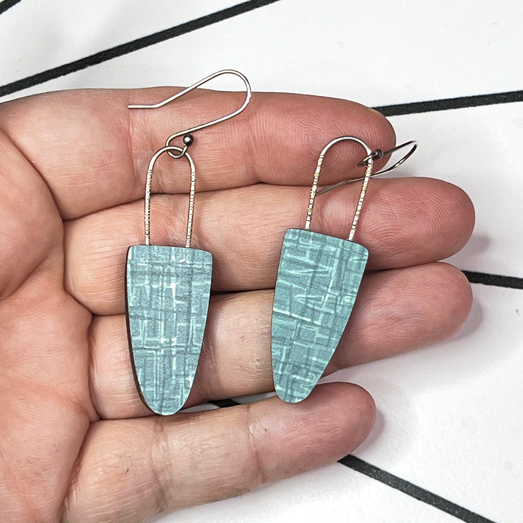 Feel so stylishly cool with these beautiful earrings: a blend of vintage teal blue hatchmark formica, sterling silver, and walnut. These contemporary modern earrings will add a touch of elegance to your ensemble.