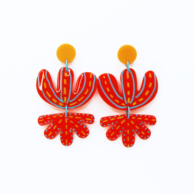 Created with tomato red and mango orange acrylic, the earring dot is 5/8 inch in diameter, the flower hangs 2 1 /2 inches from the dot.
