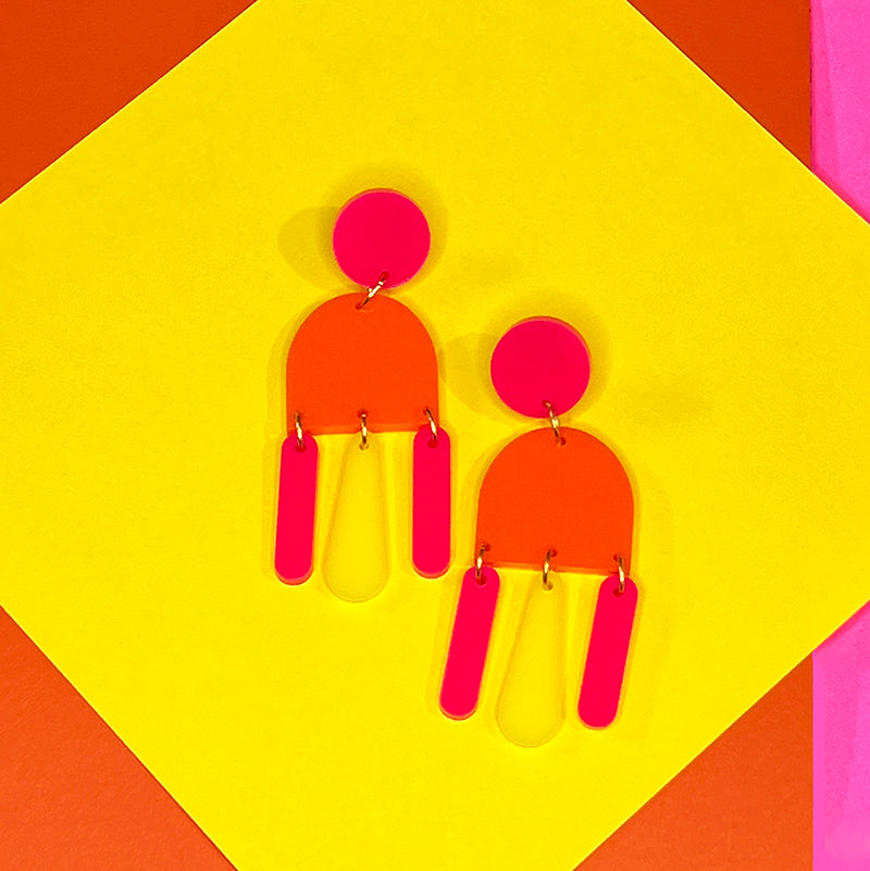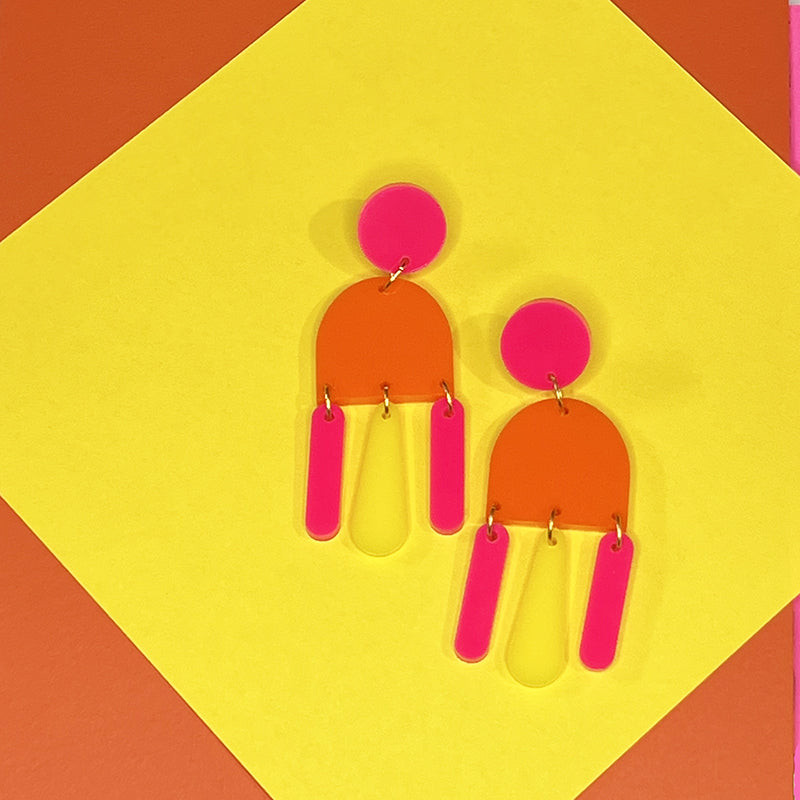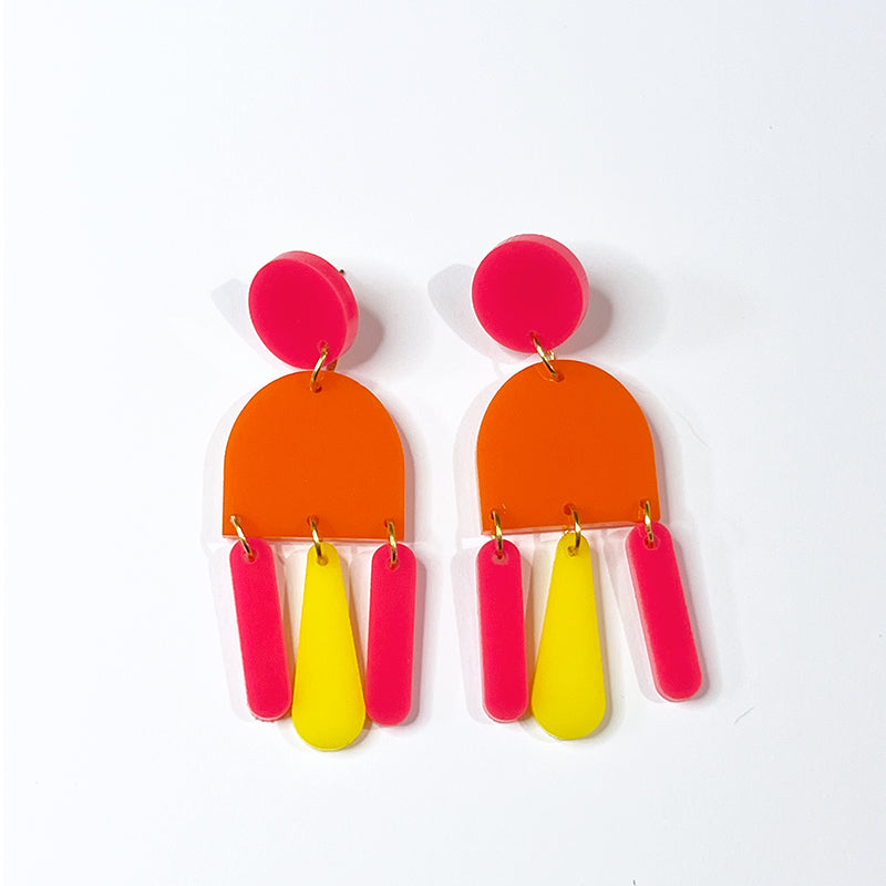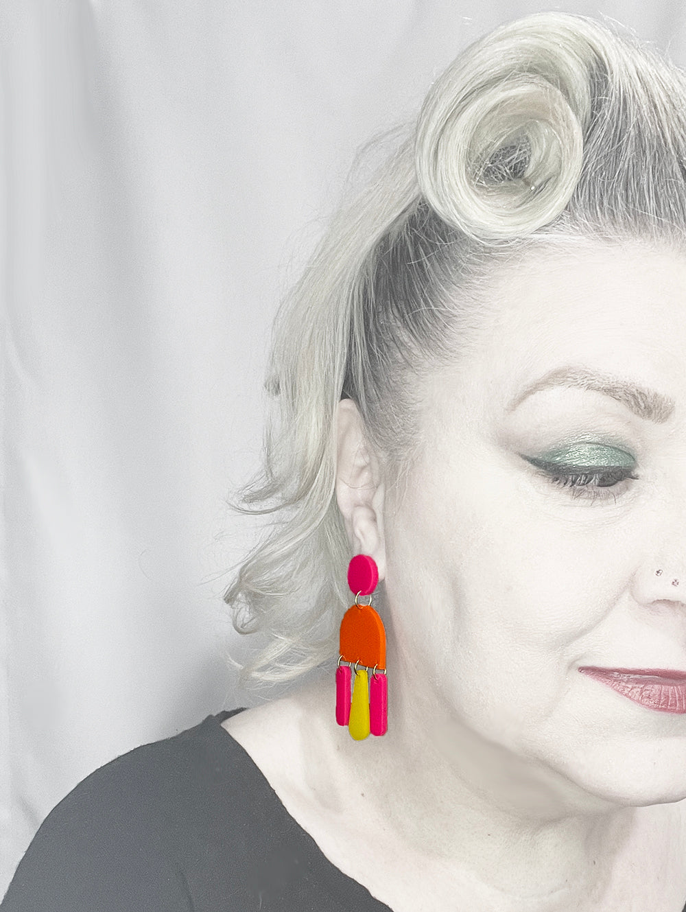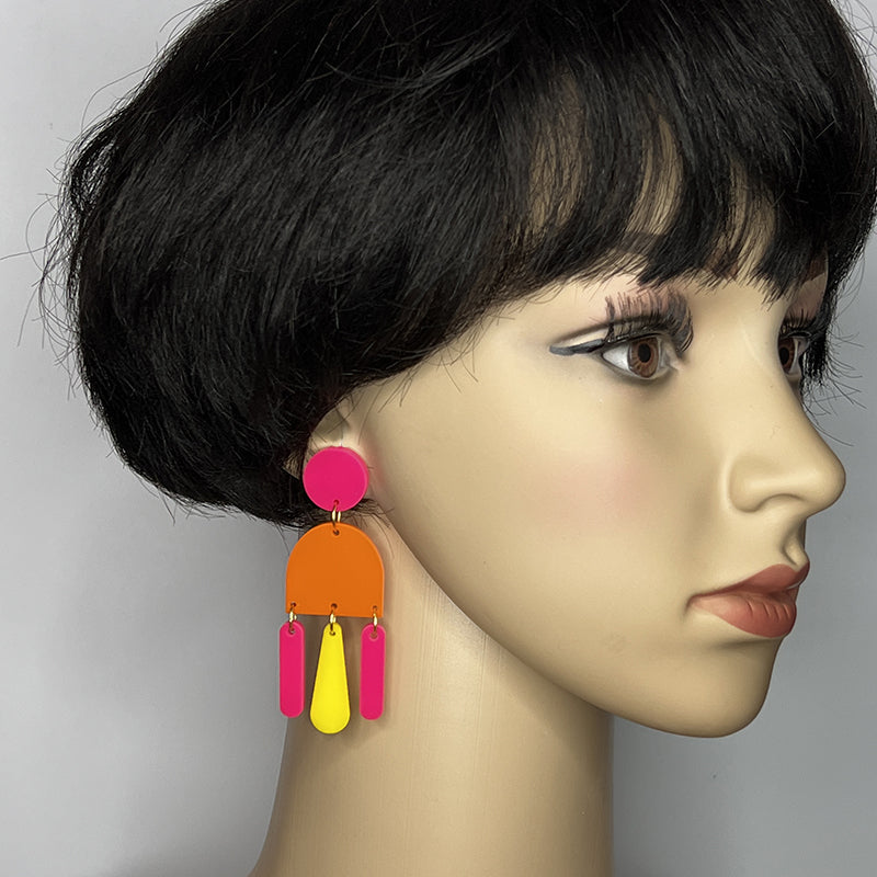 These groovy retro-style chandelier earrings are perfect for the 60s fashionista! The dragonfruit hot pink, tangerine orange and lemon yellow color combo is sure to bring a smile to your face every time you wear them. Lightweight and fun to wear.