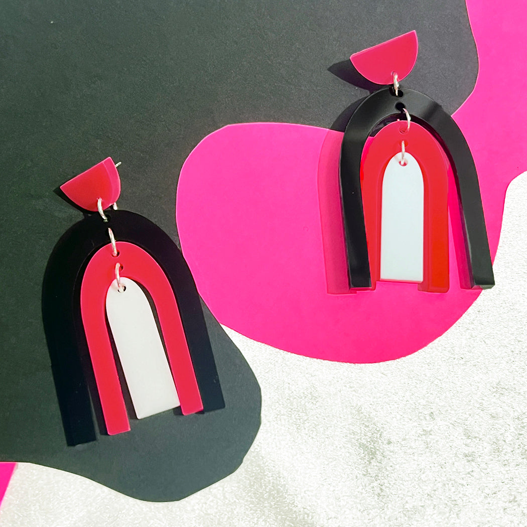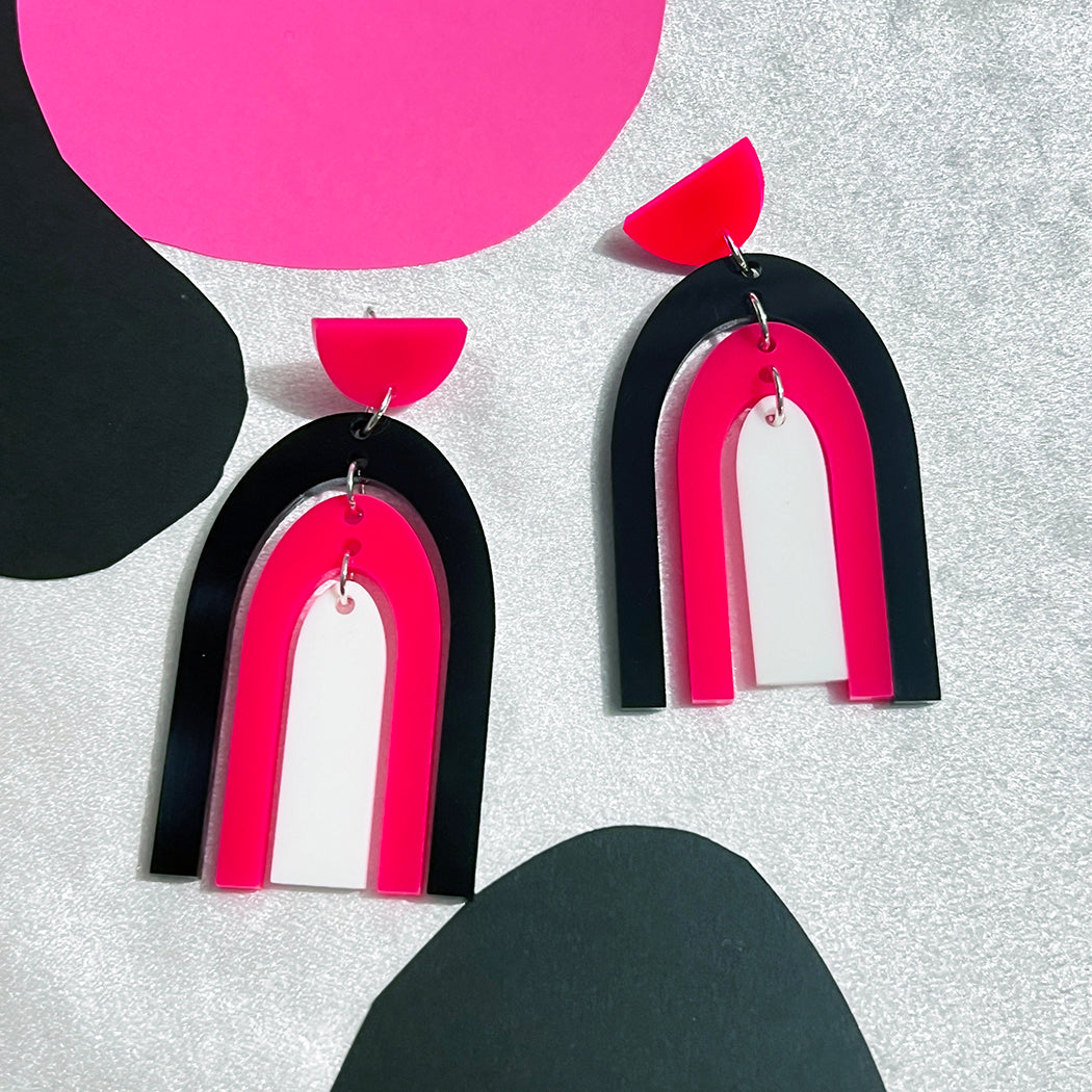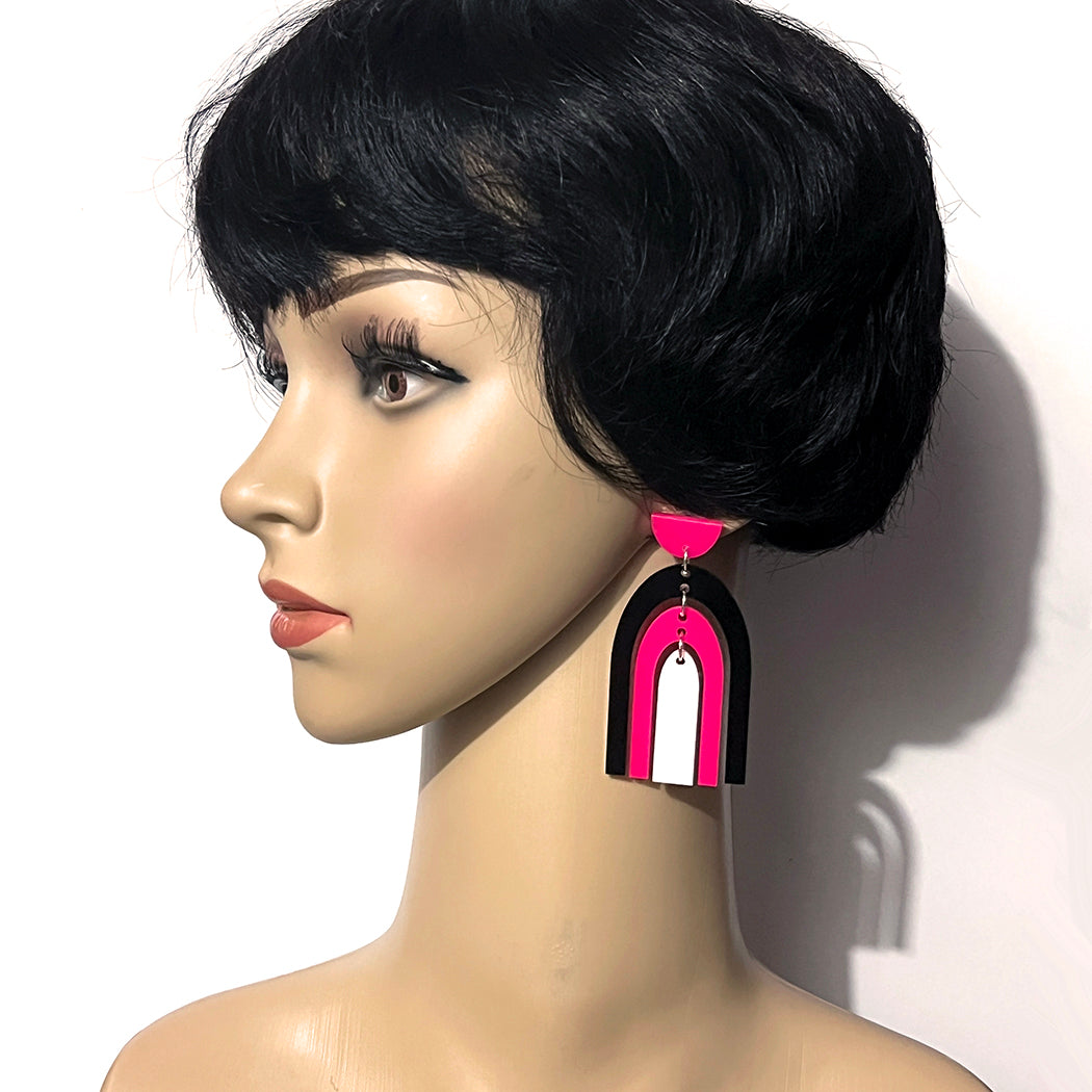 Don't let gloomy weather dull your outfit - add a pop of color with these bold and lively earrings that are sure to put a smile on your face! Extra points if they sway with every step you take. These bright hot pink, black and white arch earrings will add a real POP of color to your outfit.