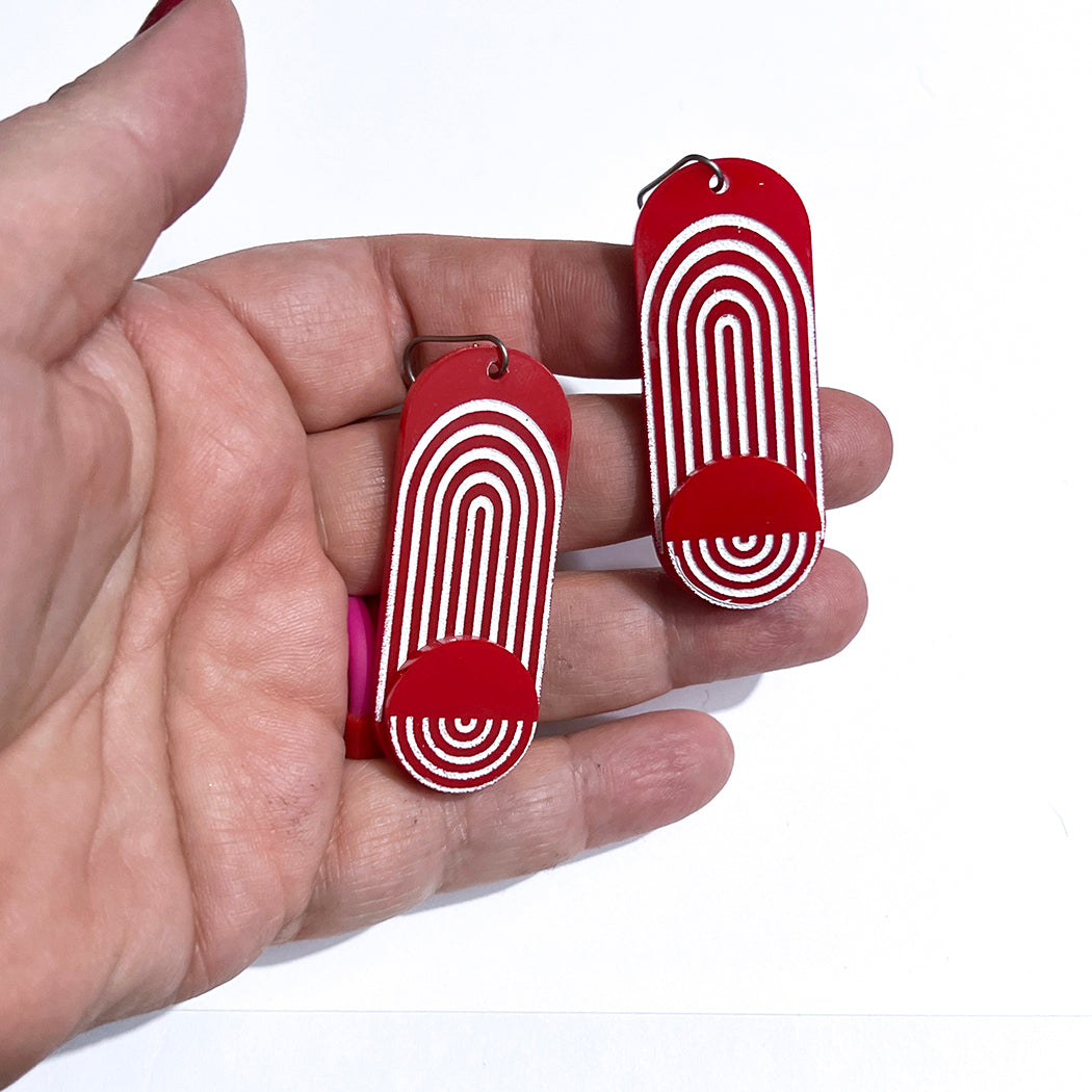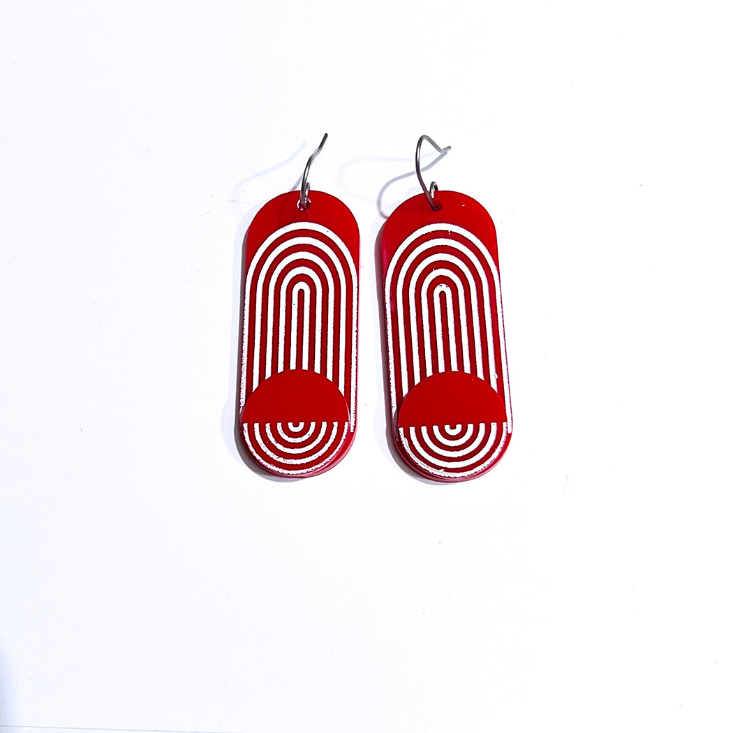 Inspired by modern architectural forms, these earrings boast a unique archway design that captures attention and sparks conversation. Make a bold statement with every step you take. The red and white color palette makes every outfit stand out.