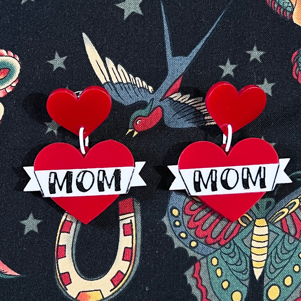 Do you have a cool Mom?? These traditional tattoo style 'MOM' heart with banner earrings are a great gift for your Mom on Mother's Day or any day you want to let her know how awesome you think she is. If you ARE the cool Mom, there's nothing wrong with getting one for yourself.
