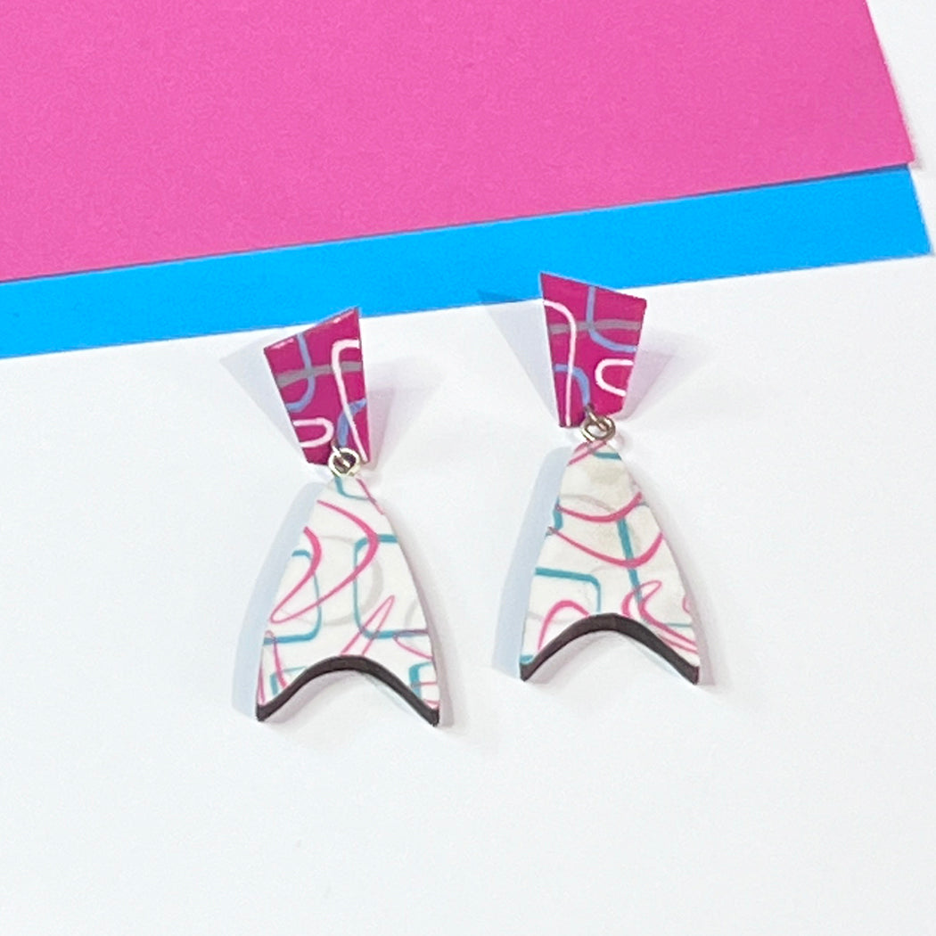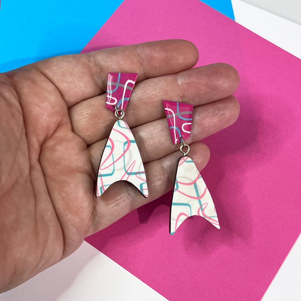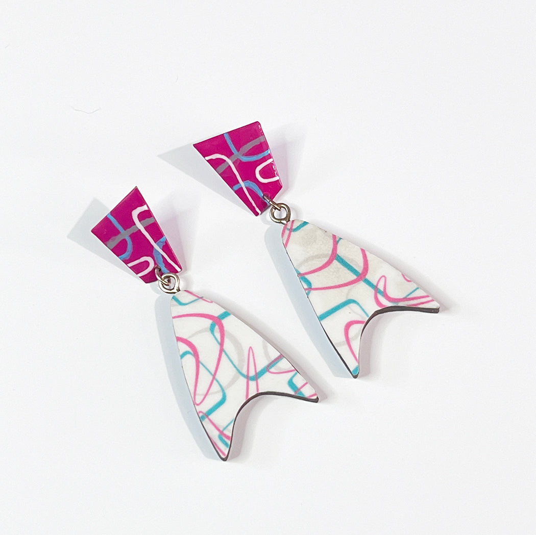 Pink, blue, and light grey doodles are the star of these earrings. The trapezoid tops are handpainted in bright pink with white, blue, and pale grey doodles. The boomerang charms are made from hand-cut, upcycled 90s-era laminate and walnut.