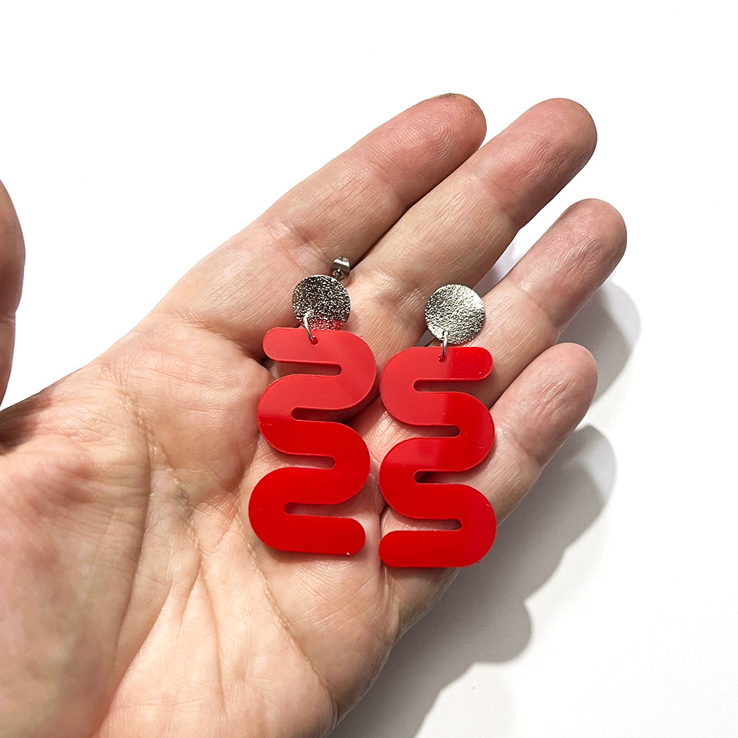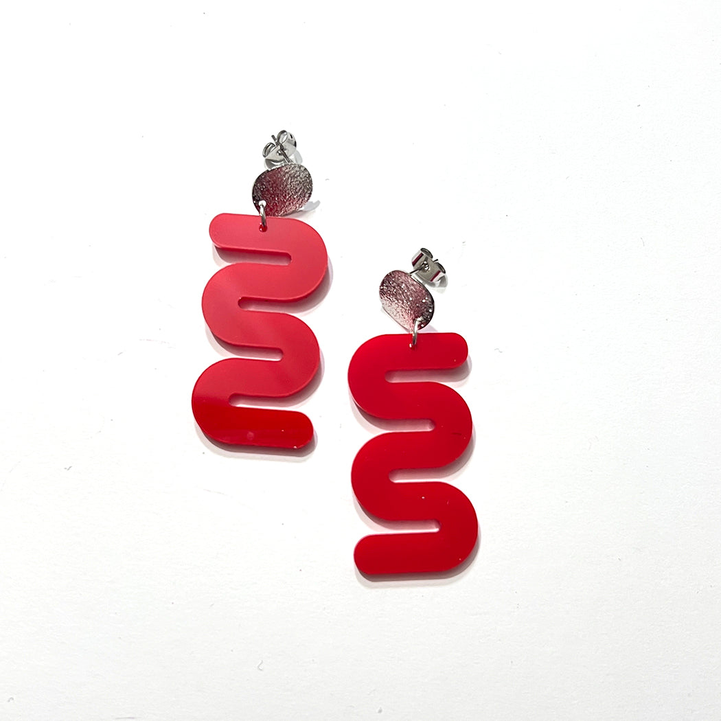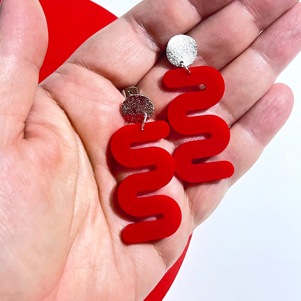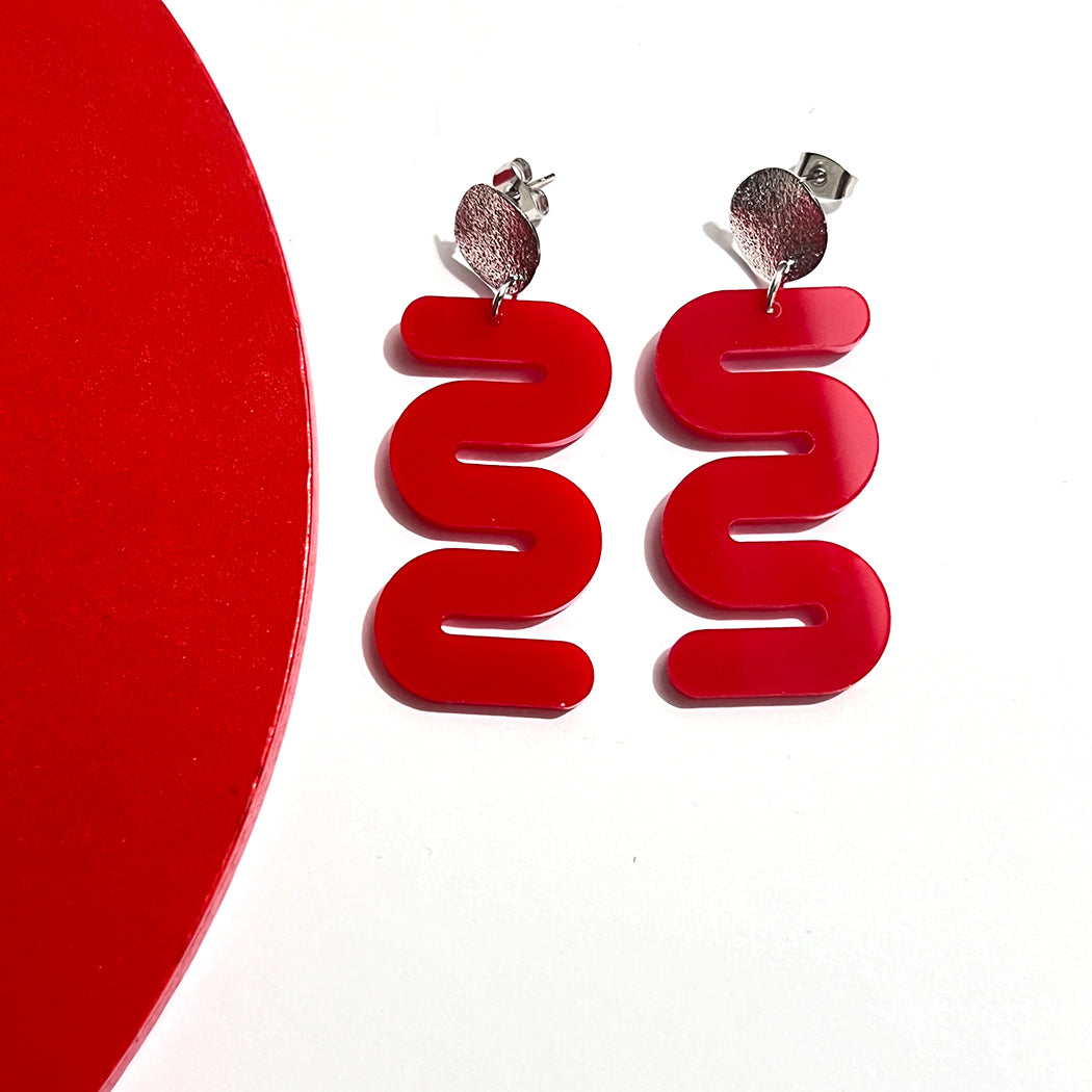 Add a burst of joy and playfulness to your outfit with our lively and vibrant red squiggle earrings.