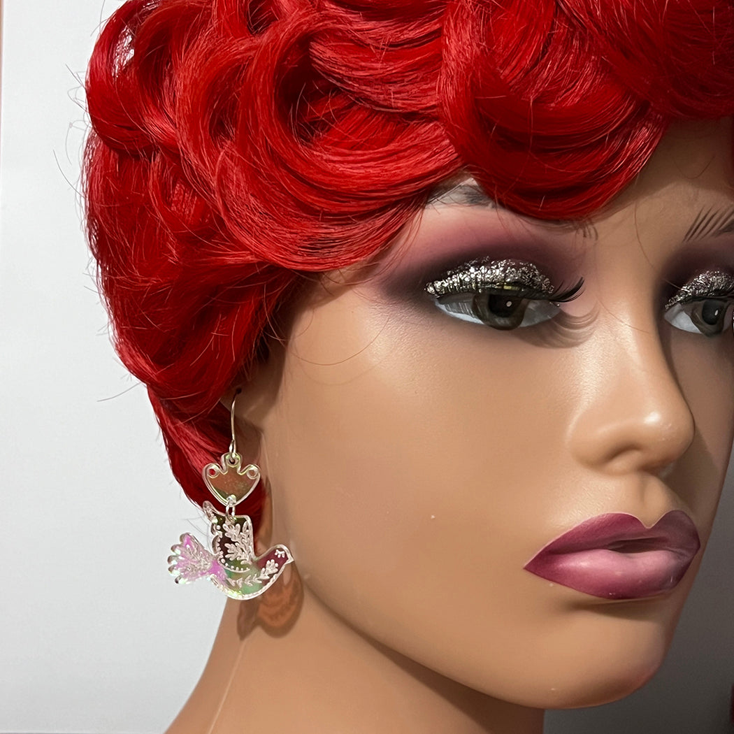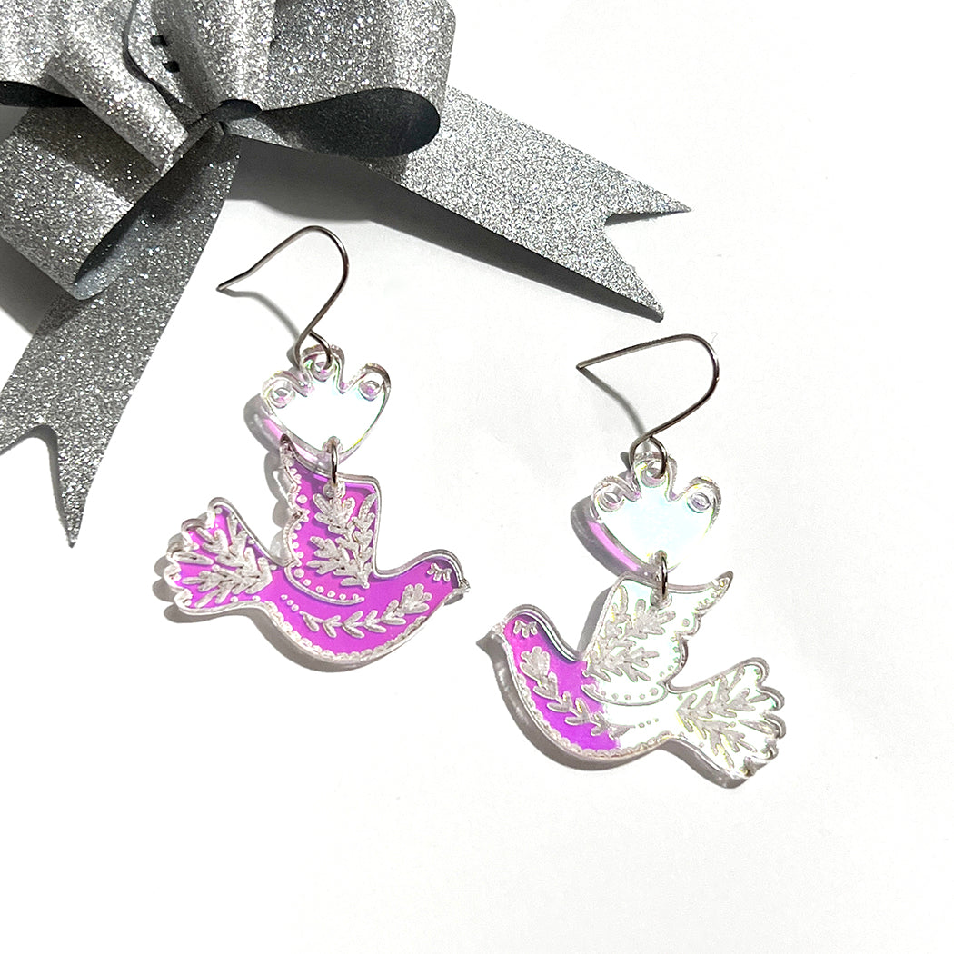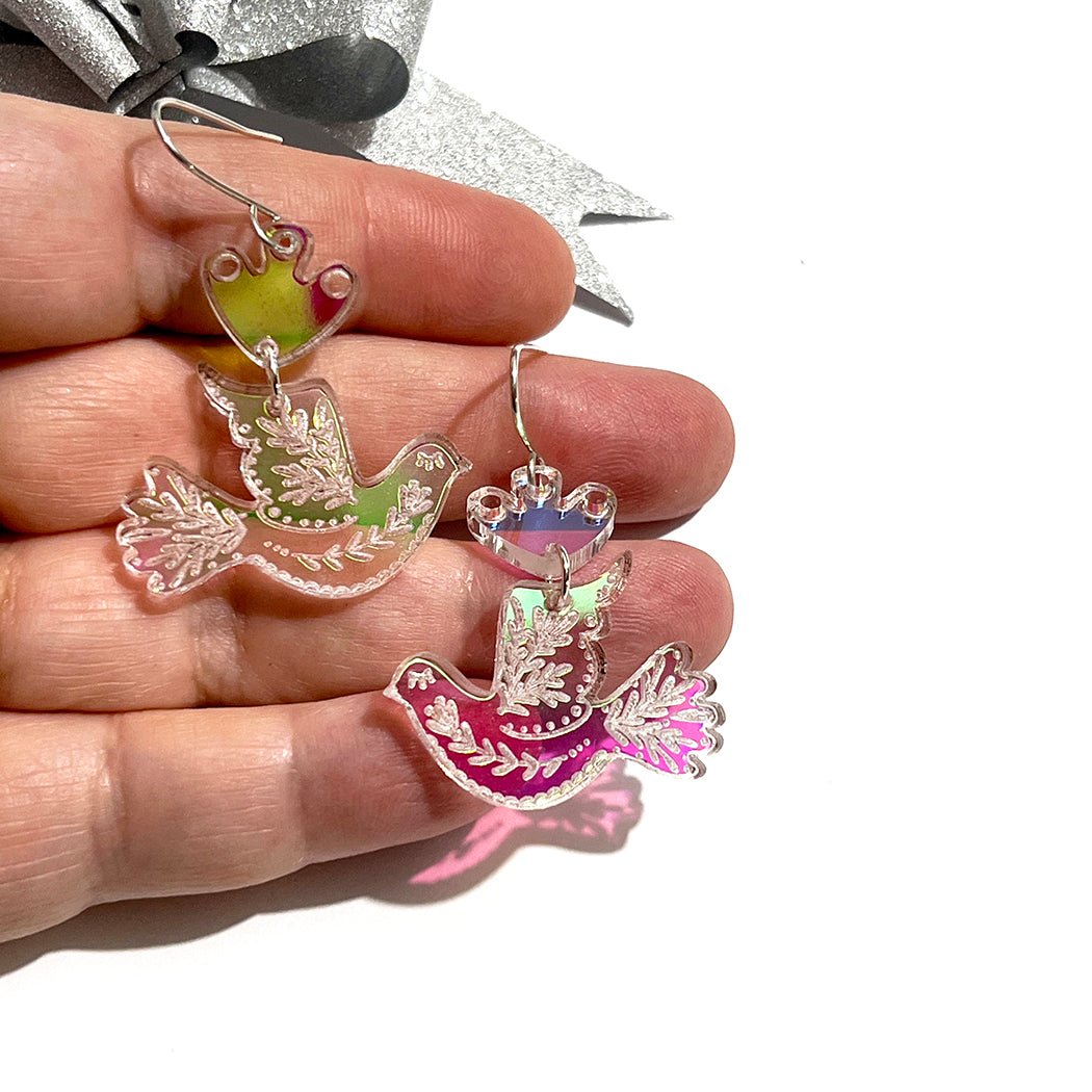 These enchanting Scandinavian Dove earrings are a stunning combination of iridescent holographic acrylic that is reminescent of the Northern Lights, bringing a little bit of Scandinavian charm to your look.