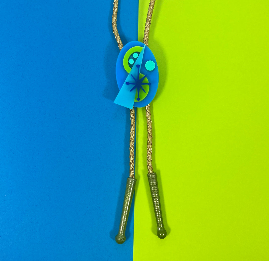 Is Space Age glam your thing??? Then you'll love this bold bolo! This bolo tie features a midcentury modern atomic starburst design with a 36-inch long metallic gold vegan leather cord.