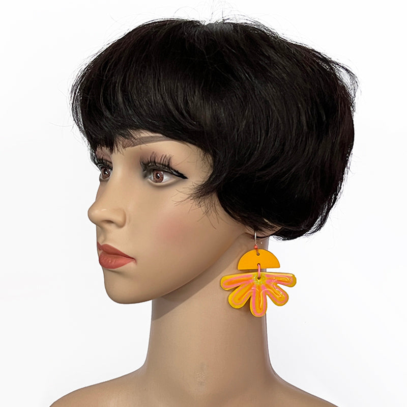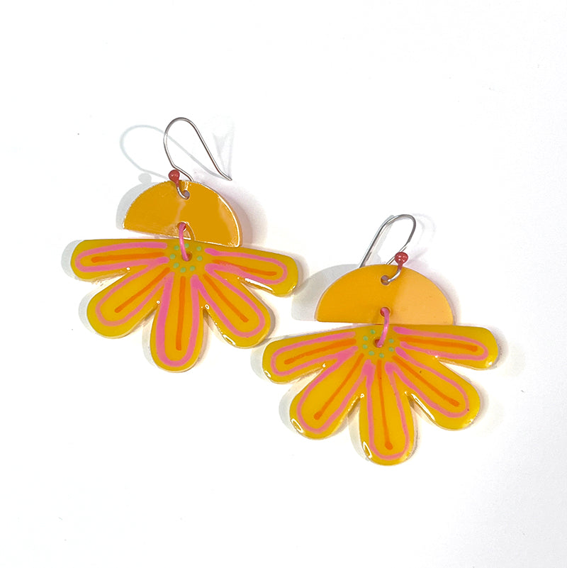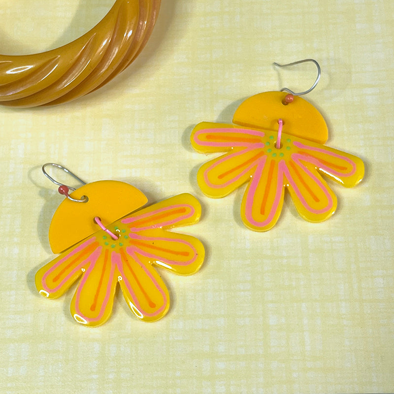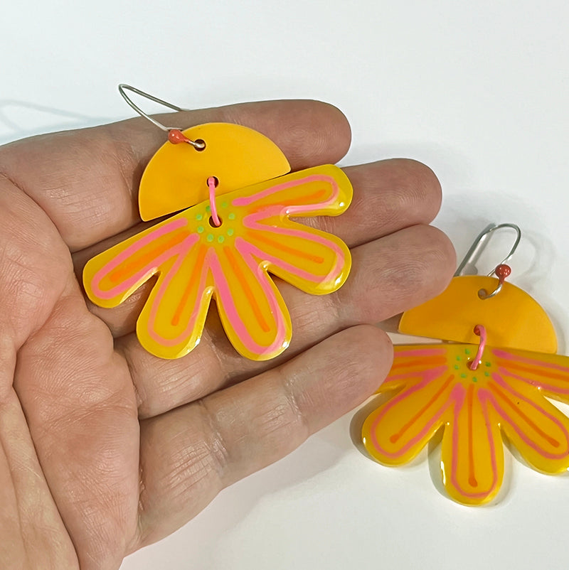 Shine bright like a beautiful sunflower. These abstract sunflower earrings have hand-painted details in pink, orange and green.