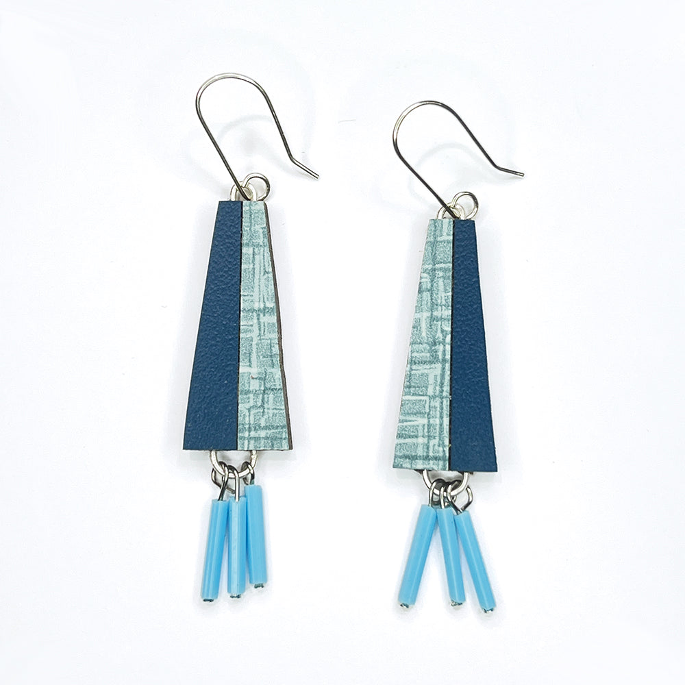Inspired by the trapezoid shapes of vintage Googie-style signage, these teal color block earrings add a unique touch to your outfit.