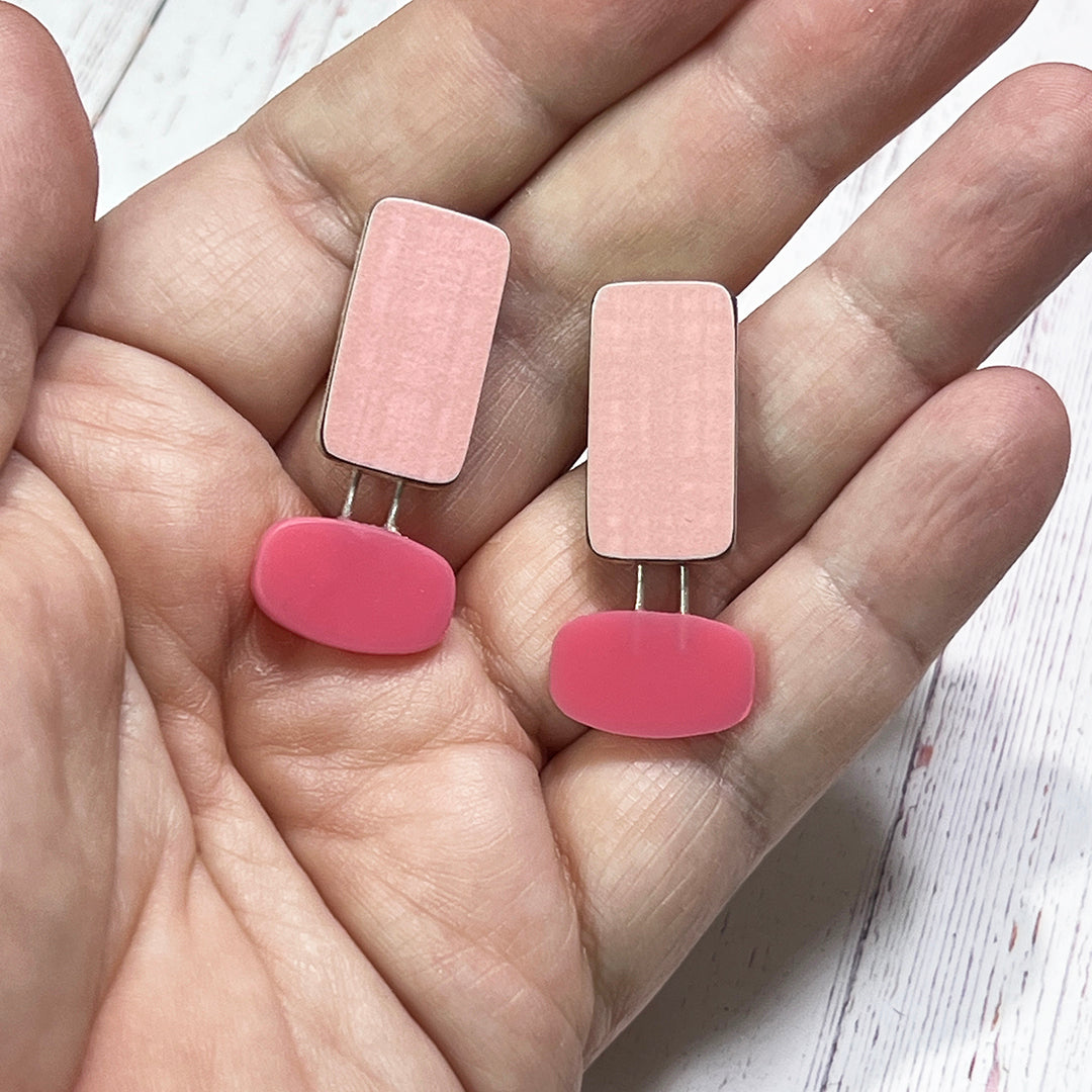 These one of a kind earrings were created with vintage pink linen print laminate, Birchwood, sterling, and matte acrylic. They measure 1 1/2 inches tall with a sterling post and ear nut.