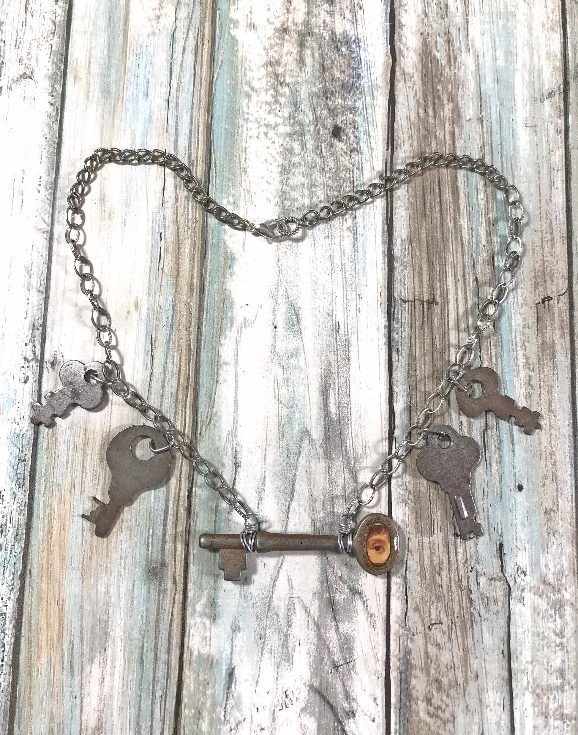 This exquisite necklace, crafted from antique keys, centers on a captivating Lovers Eye. It is a distinctive piece designed for those with a refined taste for dark romance. The necklace is 20 inches long.
