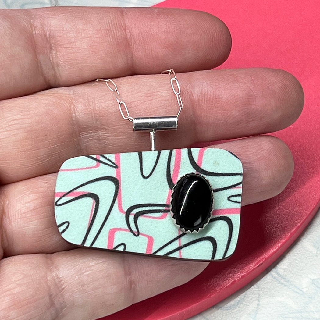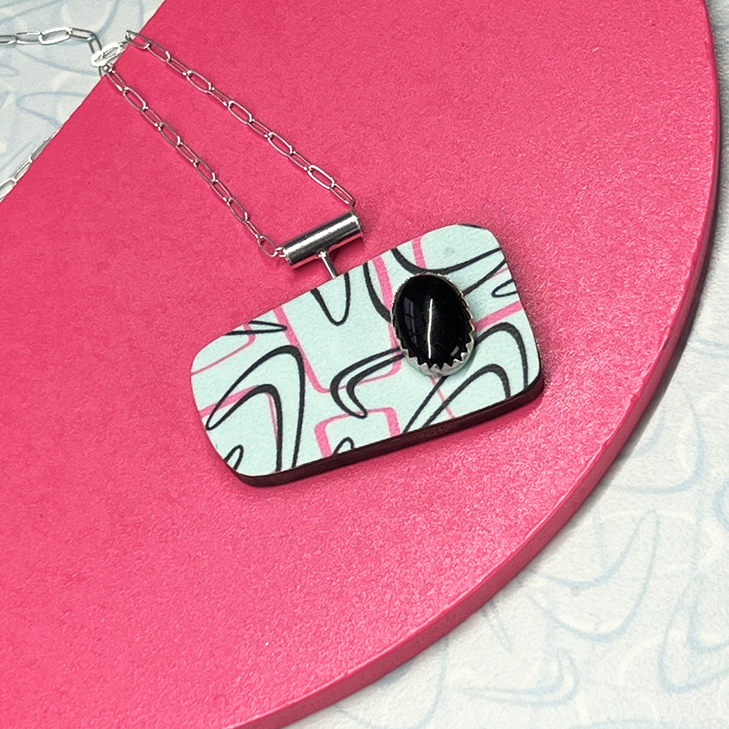 The vibrant 50s Googie-inspired necklace features colorful pink and black boomerangs on an aqua base. It is accented with a rich black Onyx stone.