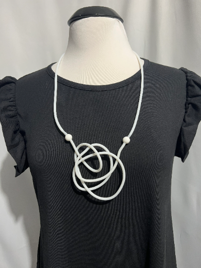 Inspired by abstract art sketches. This oversize necklace will give your outfit an artistic flare. Made with silicone, acrylic and steel.
